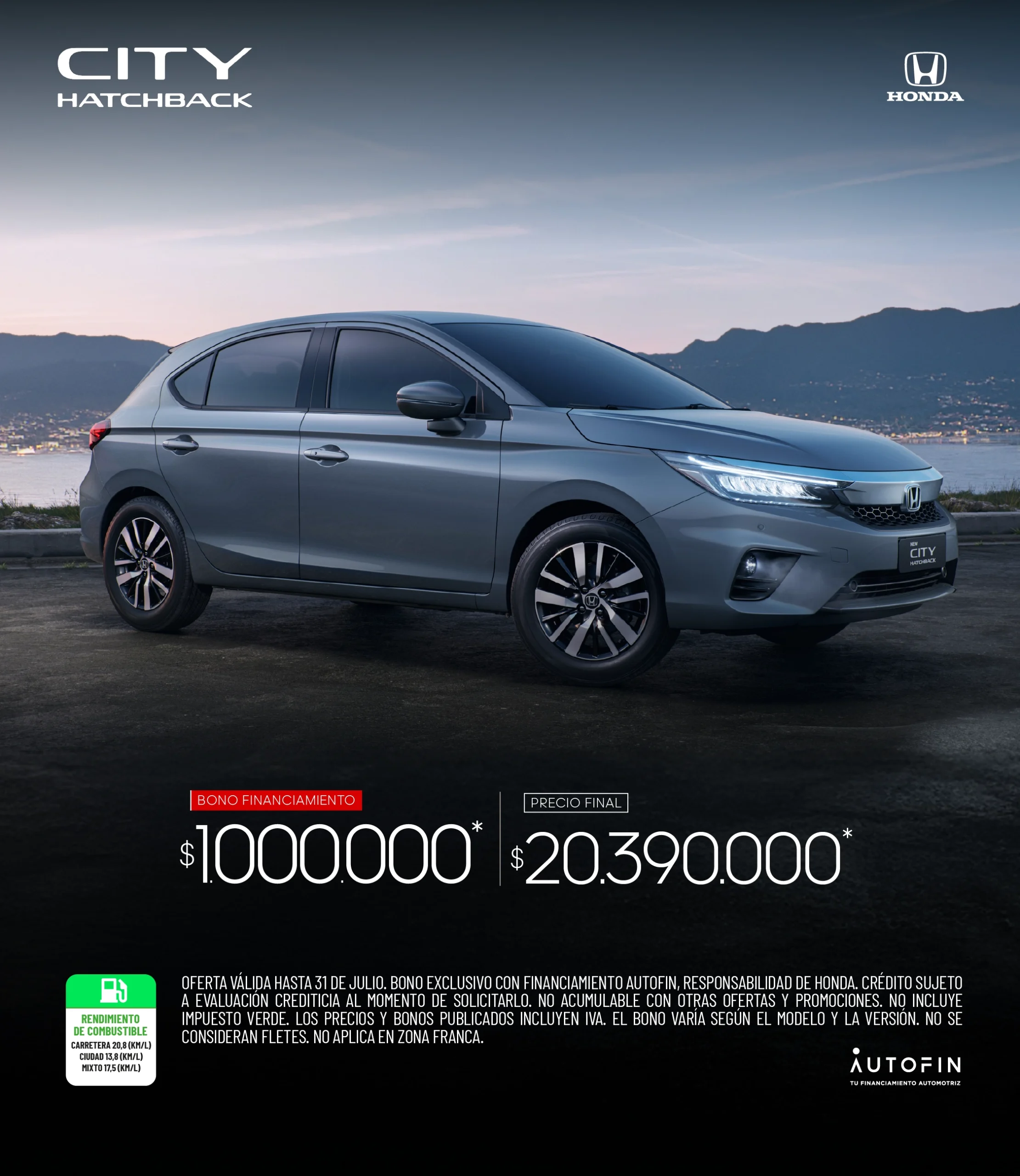 | Oferta válida hasta el 31 de agosto de 2025. Precio de venta de $16.990.000, (no incluye impuesto verde) incluye bono. Crédito sujeto a evaluación crediticia por parte de AUTOFIN S.A., al momento de solicitarlo. Crédito en modalidad Auto Renuévate. Pie 50% . Monto del crédito de $11.399.400, en 60 cuotas mensuales de $189.990 más una última cuota denominada VFMG de $5.097.000. Costo total del crédito $16.496.400. No acumulable con otras promociones u ofertas. Los precios y bonos publicados incluyen IVA. El bono varía según el modelo y la versión. No se consideran fletes. No aplica en Zona Franca. Valor impuesto verde para la versión publicada de $257.430. Los valores varían según cotización en cada concesionario y los precios indicados corresponden a los valores calculados para el modelo publicado a la fecha 31 de agosto de 2025. |