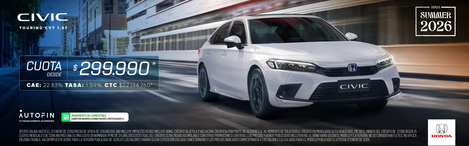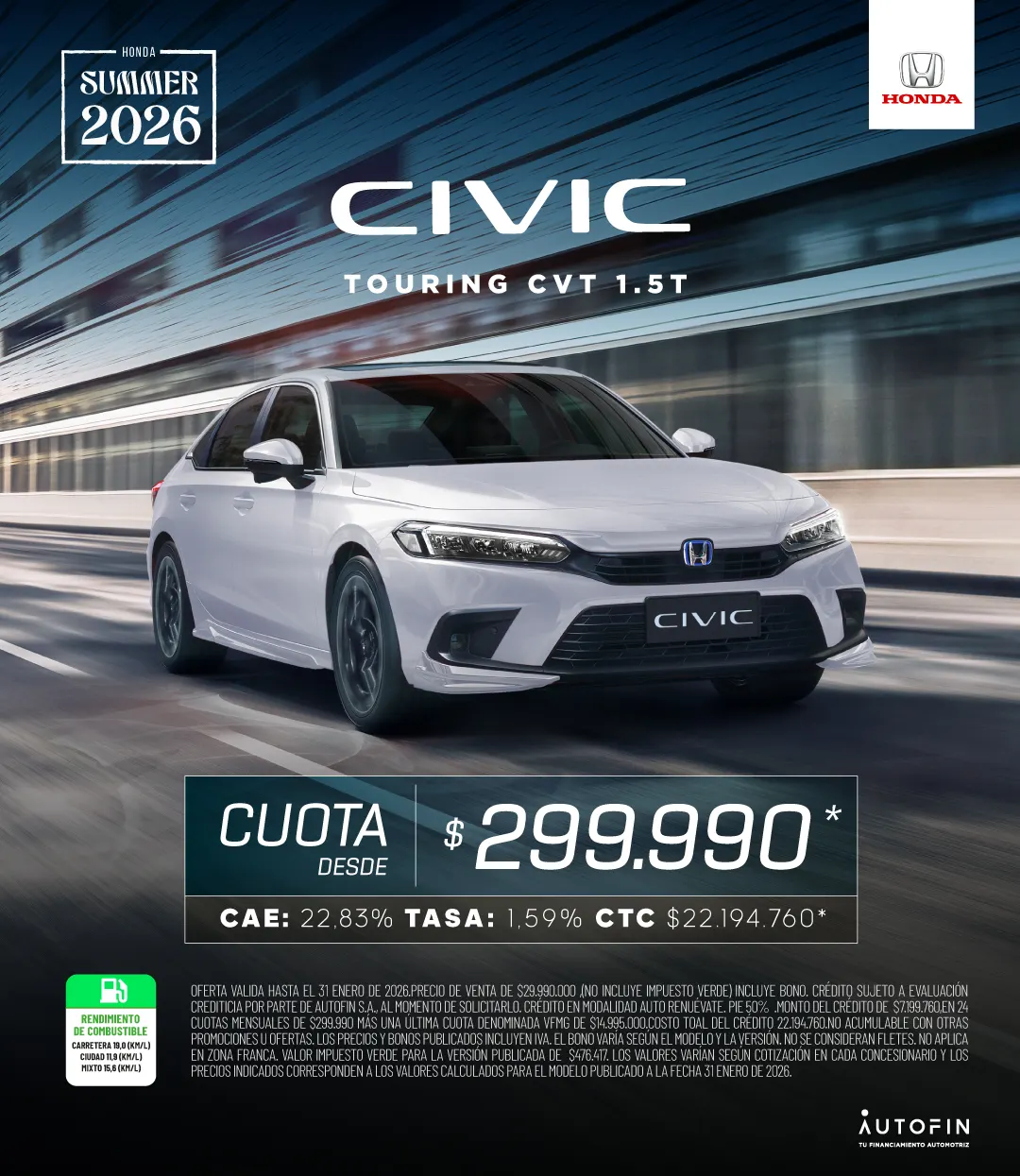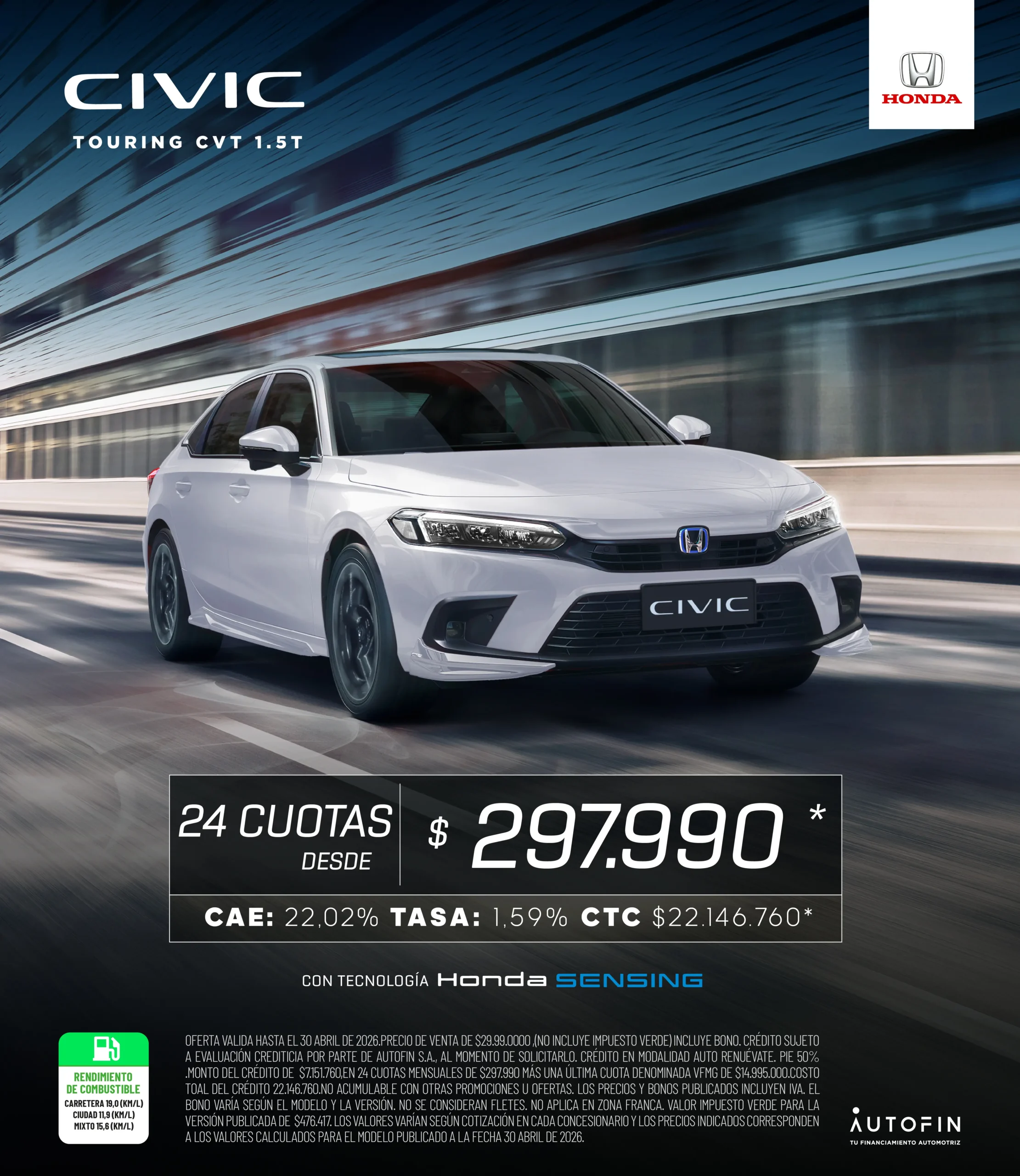 Esta nueva generación del Civic llega con mayor deportividad, más potencia, mayor espacio y comodidad en sus características y elementos principales. Su nuevo diseño es más futurista y muestra la evolución en uno de los modelos más icónicos de Honda. *Disponible en versión Touring.