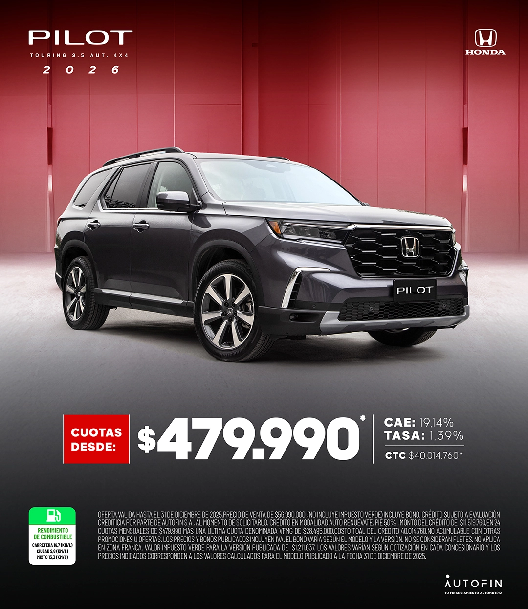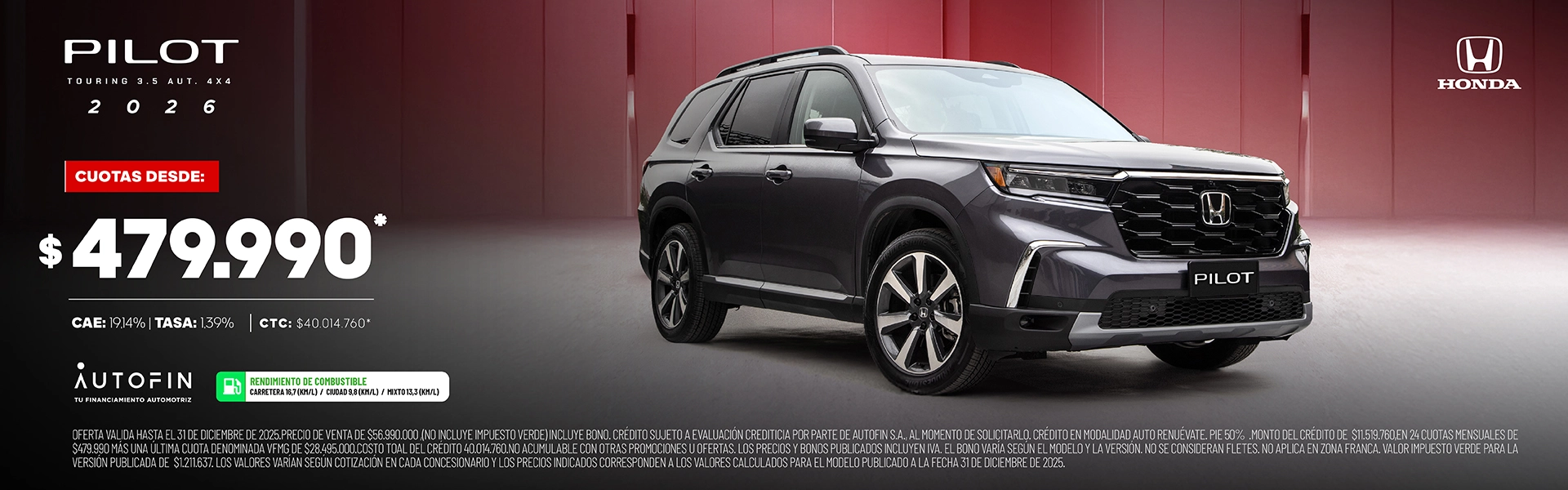 Oferta válida hasta 31 de diciembre. Bono exclusivo con financiamiento Autofin, responsabilidad de Honda. Crédito sujeto a evaluación crediticia al momento de solicitarlo. No acumulable con otras ofertas y promociones. No incluye impuesto verde. Los precios y bonos publicados incluyen IVA. El bono varía según el modelo y la versión. No se consideran fletes. No aplica en Zona Franca.