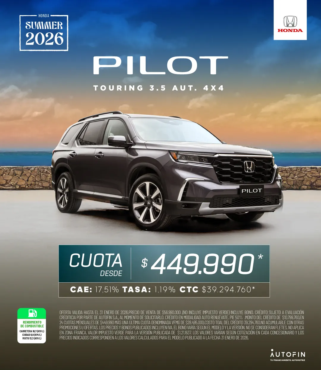Oferta válida hasta 31 de enero. Bono exclusivo con financiamiento Autofin, responsabilidad de Honda. Crédito sujeto a evaluación crediticia al momento de solicitarlo. No acumulable con otras ofertas y promociones. No incluye impuesto verde. Los precios y bonos publicados incluyen IVA. El bono varía según el modelo y la versión. No se consideran fletes. No aplica en Zona Franca.